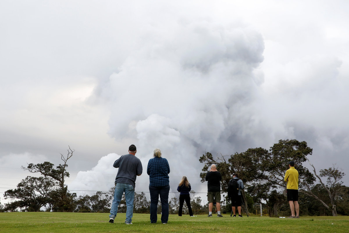 People watch as ash erupts from the Halemaumau crater near the community of Volcano during ongoing eruptions of the Kilauea Volcano in Hawaii, U.S., May 15, 2018. REUTERS/Terray Sylvester