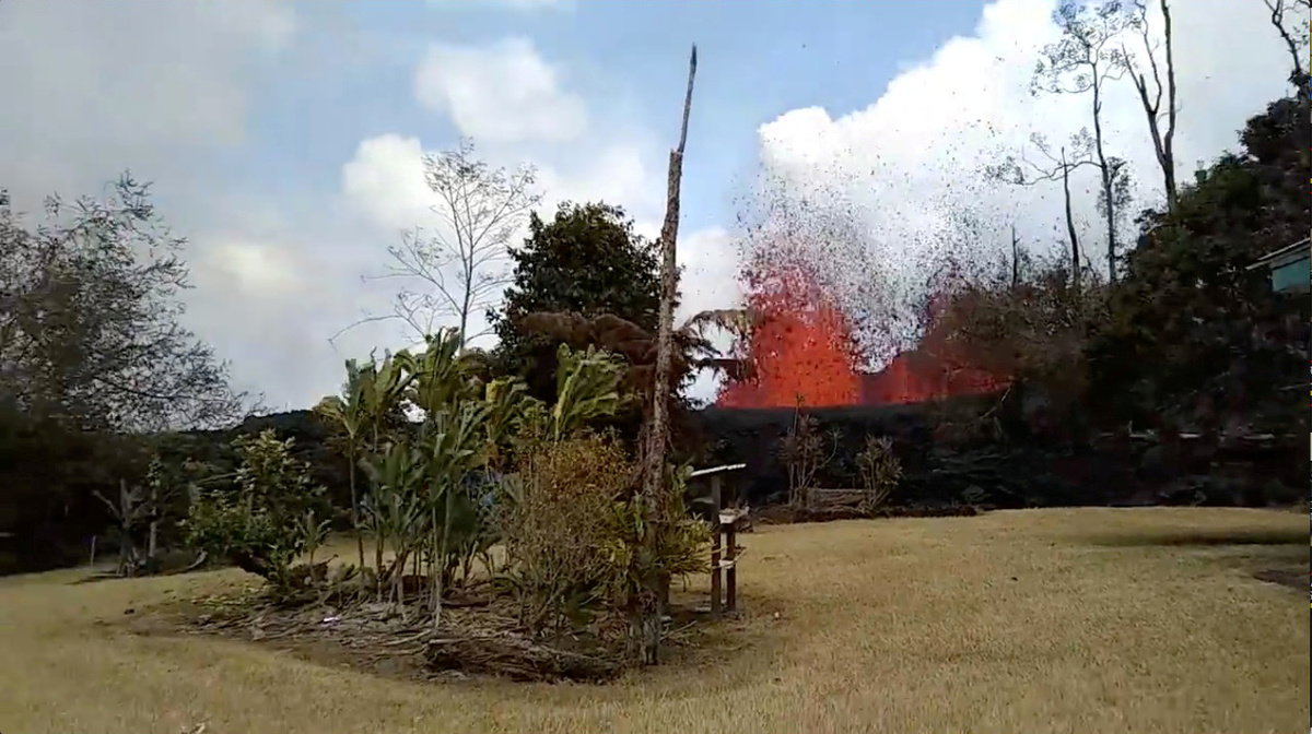 Lava is seen from a fissure appearing behind a resident's backyard in Puna. KEITH BROCK/Social Media via REUTERS