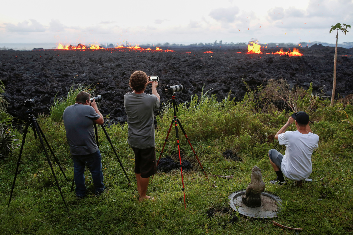 Photographers take photos of a fissure on the outskirts of Pahoa May 14, 2018. REUTERS/Terray Sylvester
