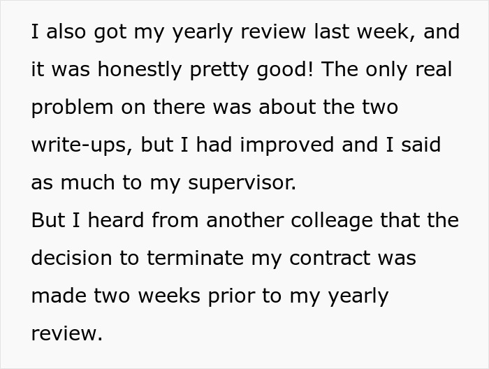 He even shared that his fellow employees were heartbroken about his contract termination and tried to stand up for him to their boss