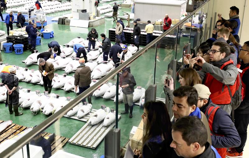 One of the appeals of Toyosu is being able to see the market in action. During the school vacation in spring, children line up along the visitors' route to take in the experience.