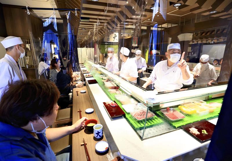 Sushi restaurant Daiwa Zushi at the market reopened after installing vinyl sheets along the counter to prevent splashing.