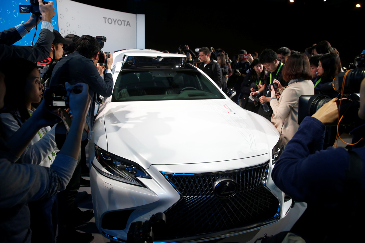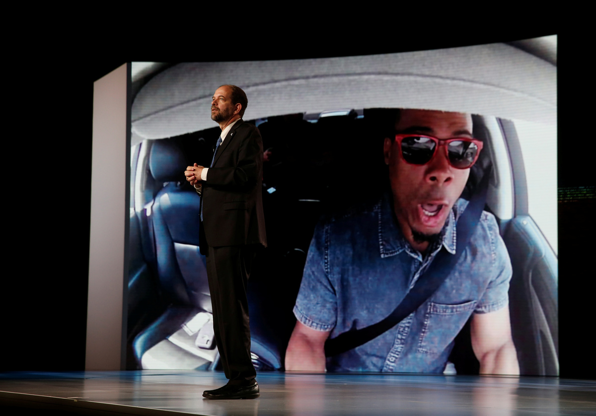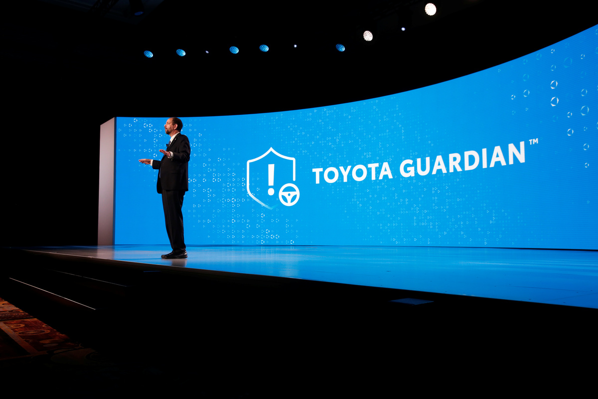 Gill Pratt, CEO of the Toyota Research Institute (TRI), speaks on the Toyota Guardian, an accident avoidance system that assists drivers, during a Toyota news conference at the 2019 CES in Las Vegas, Nevada, U.S. January 7, 2019. REUTERS/Steve MarcusBob Carter, executive vice president of sales for Toyota Motor North America, speaks during a Toyota news conference at the 2019 CES in Las Vegas, Nevada, U.S. January 7, 2019. REUTERS/Steve MarcusPerception stack sensors are shown on the roof of a research vehicle equipped with Toyota Guardian, an accident avoidance system that assists drivers, during a Toyota news conference at the 2019 CES in Las Vegas, Nevada, U.S. January 7, 2019. REUTERS/Steve MarcusJournalists take photos of a research vehicle equipped with Toyota Guardian, a accident avoidance system that assists drivers, during a Toyota news conference at the 2019 CES in Las Vegas, Nevada, U.S. January 7, 2019. REUTERS/Steve Marcus