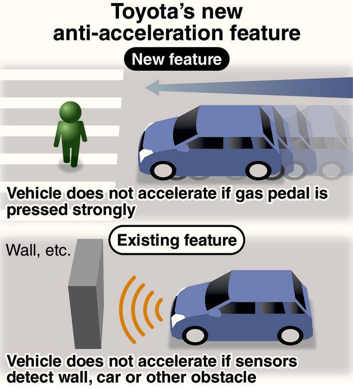 Amid a spate of high-profile accidents involving elderly people who made mistakes using the gas and brake pedals, however, Toyota has concluded that such a function to suppress engine output is necessary to prevent accidents involving pedestrians and bicycles. The automaker believes the new feature won't cause much confusion as long as it is installed only for those who want it, according to the sources.