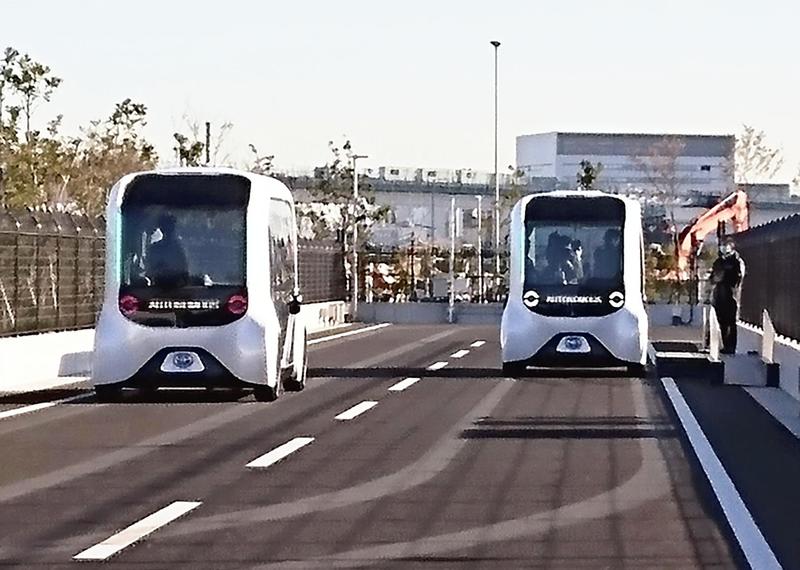Four e-Palettes carried passengers on a course at a Tokyo facility during a recent demonstration of the new operations management system, which constantly monitors the speed and location of the vehicles. The e-Palettes were shown avoiding collisions and stopping at precise locations.