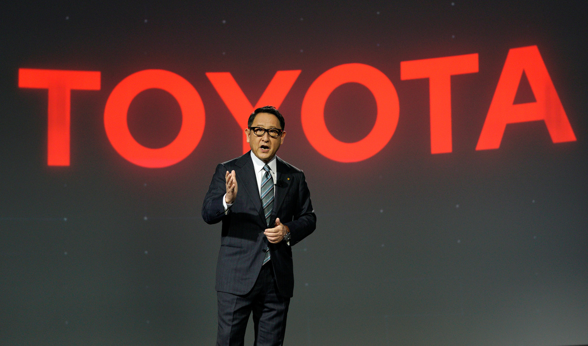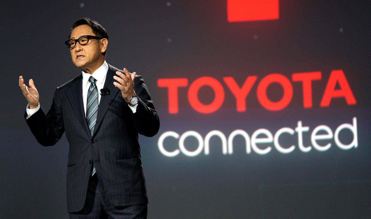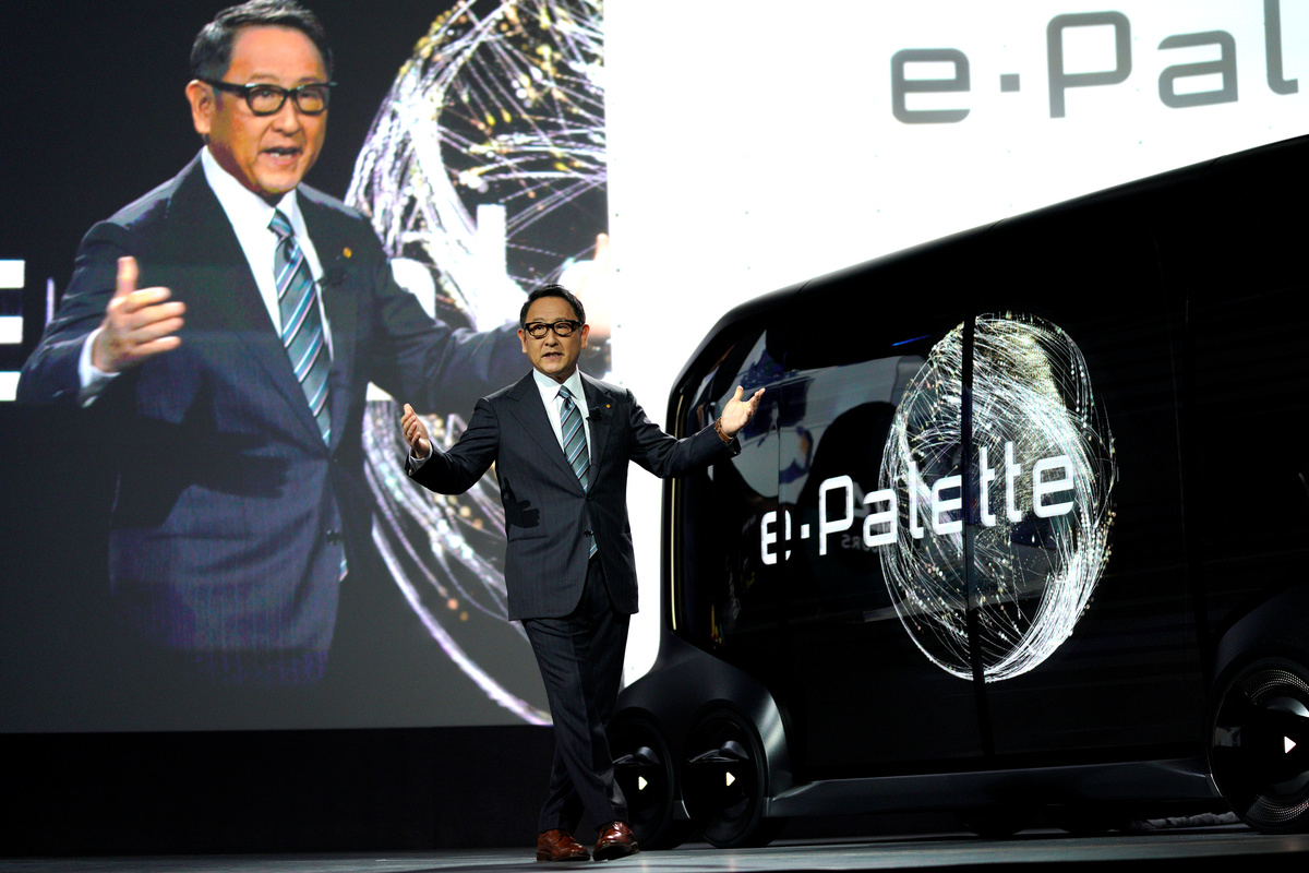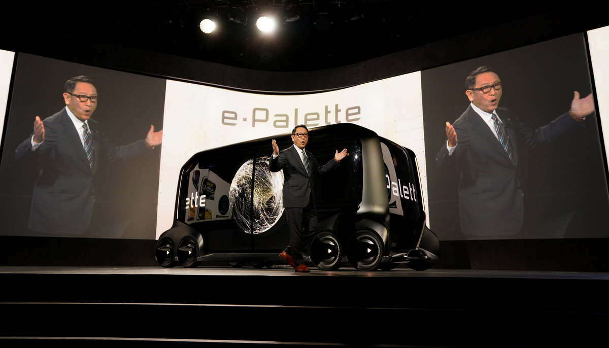 Akio Toyoda, president of Toyota Motor Corporation, is seen after he announced the "e-Pallete", a new fully self-driving electric concept vehicle designed to be used for ride hailing, parcel delivery services and other uses at CES in Las Vegas, Nevada, U.S., January 8, 2018. REUTERS/Rick WilkingToyota Motor Corporation, displays the "e-Pallete", a new fully self-driving electric concept vehicle designed to be used for ride hailing, parcel delivery services and other uses at CES in Las Vegas, Nevada, U.S., January 8, 2018. REUTERS/Rick WilkingAkio Toyoda, president of Toyota Motor Corporation, announces the "e-Pallete", a new fully self-driving electric concept vehicle designed to be used for ride hailing, parcel delivery services and other uses at CES in Las Vegas, Nevada, U.S., January 8, 2018. REUTERS/Rick WilkingAkio Toyoda, president of Toyota Motor Corporation, announces the "e-Pallete", a new fully self-driving electric concept vehicle designed to be used for ride hailing, parcel delivery services and other uses at CES in Las Vegas, Nevada, U.S., January 8, 2018. REUTERS/Rick Wilking
