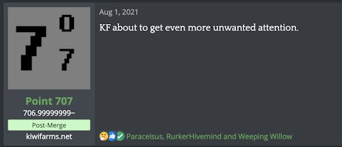 Many online assume that Moon and company must be lashing out due to depression or low self-esteem — but a 2020 study looking at online trolling, by Australian researchers Evita March and Genevieve Steele, suggests otherwise. Looking specifically at behavior and motivation, Steele and March concluded (somewhat unsurprisingly) that there is a strong link between trolling, sadism, and psychopathy. Those who send the occasional abusive message may be working out their own mental health struggles but, for those who regularly behave as Kiwi Farms does, the harm done to their recipients is their motivation.