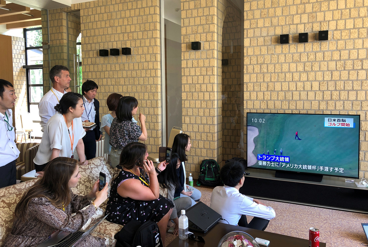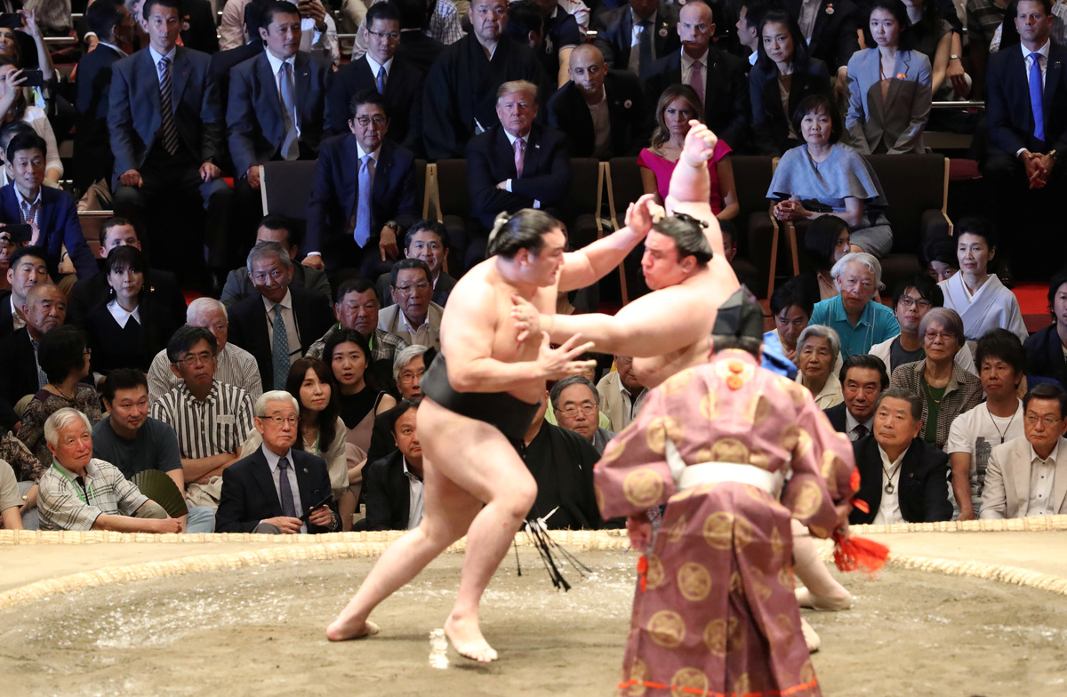 But it was all smiles on Sunday as the two leaders played golf and later, with wives Melania and Akie, watched giant sumo wrestlers grapple on the final day of a 15-day tournament won by rising Japanese star Asanoyama.