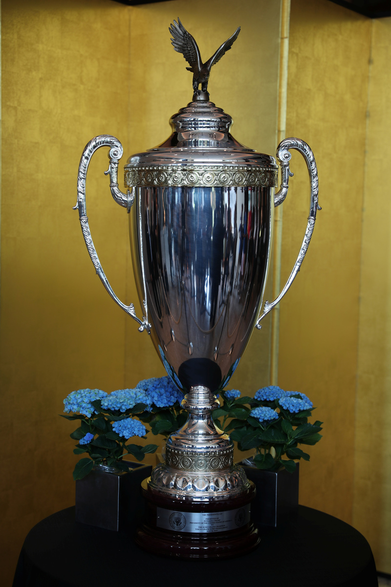 Trump, using a special set of wooden stairs fitted to the sumo ring, presented the 25-year-old Asanoyama with the President's Cup, a trophy topped with a bald eagle, the U.S. national bird.