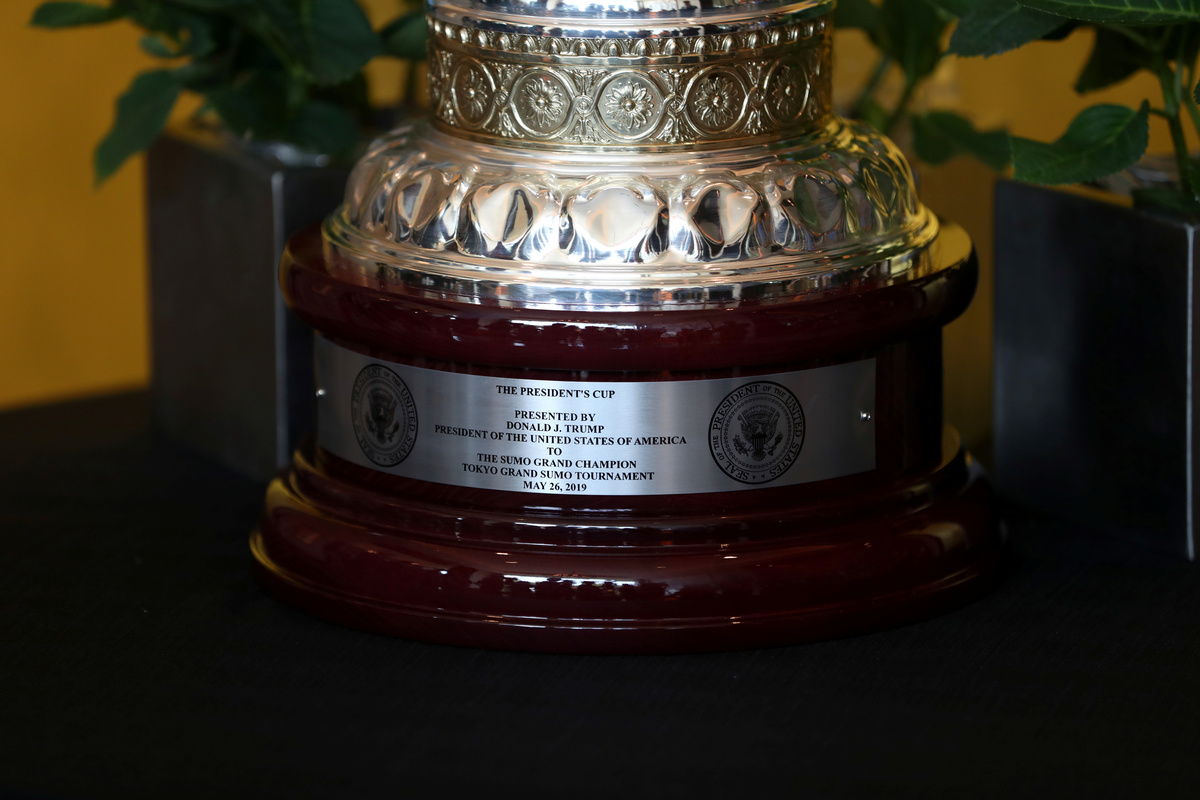 "In honour of your outstanding achievement as Sumo Grand Champion, I hereby award you the United States President's Cup," Trump said, reading from a prize certificate.