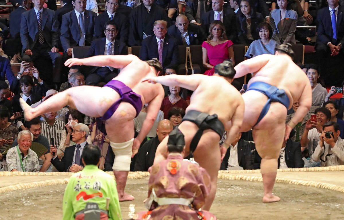 Arriving just in time for Asanoyama's bout, Trump nodded as Abe gestured in explanation, later watching as the three final wrestlers, wearing only traditional loincloths, lifted their legs high and stamped them to the ground in a ritual entrance.