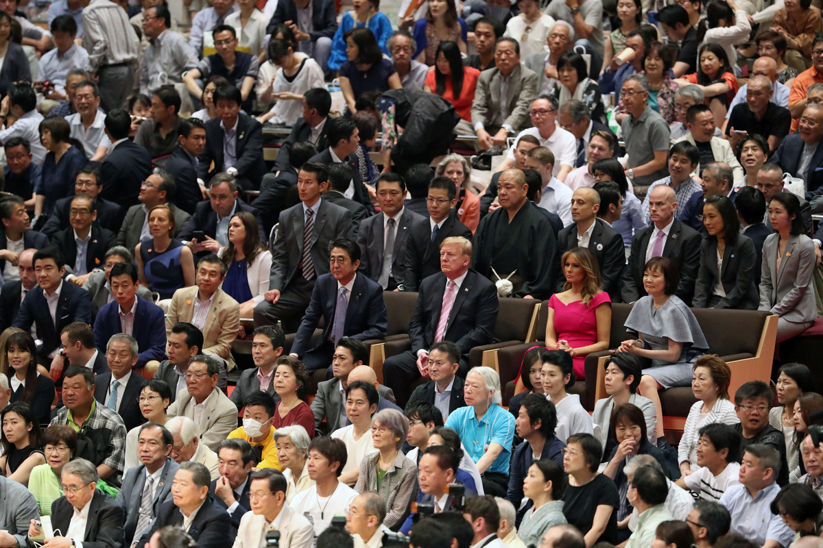 Trump, the first U.S. president to watch sumo in the sport's homeland, waved to the audience as he entered the hallowed Kokugikan and then saluted them with applause as they waved and raised their phones to take photos.