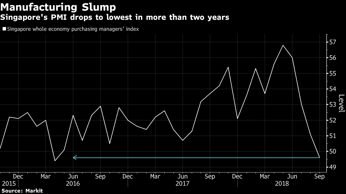 There are already troubling signs in Asia. Surveys from China to Indonesia showed a decline in manufacturing sentiment in September, signaling weaker activity stemming from the U.S.-China tensions. Singapore’s purchasing managers index plunged to its lowest in more than two years.
