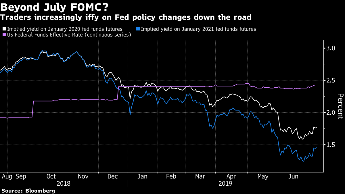 Traders are still pricing a full quarter-point reduction in July, yet they have slowly scaled back views on how much easing will take place for all of 2019 -- lowering expectations to 64 basis points from around 80 basis points two weeks ago. At the same time, options traders are still adding to bets the Fed will embark on a series of cuts, rather than a one-and-done approach.