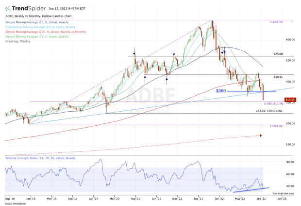 As the weekly chart above shows, Adobe stock is breaking below longtime uptrend support (blue line). This support mark begins in late 2018 and includes the 2020 covid low and the June 2022 low.