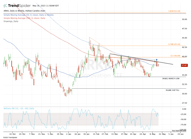 If the ARKK ETF can close above $40, not only will it clear these measures, it will also regain the 50% retracement from the recent low to the 2023 high.