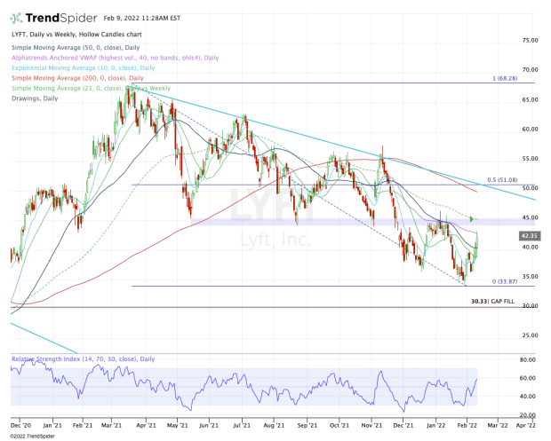 Like Lyft, it’s been unable to generate a meaningful bounce. If it rallies on earnings, see how it handles the $42 to $43 area. There it finds the declining 21-week moving, weekly VWAP measure and channel resistance.