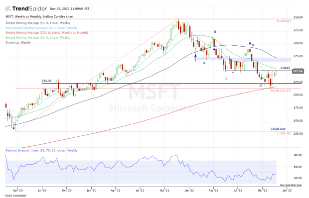 If Microsoft stock can clear this level and the 21-week moving average, it opens the door up to the $267 to $275 zone, where it finds prior resistance and the declining 50-week moving average.
