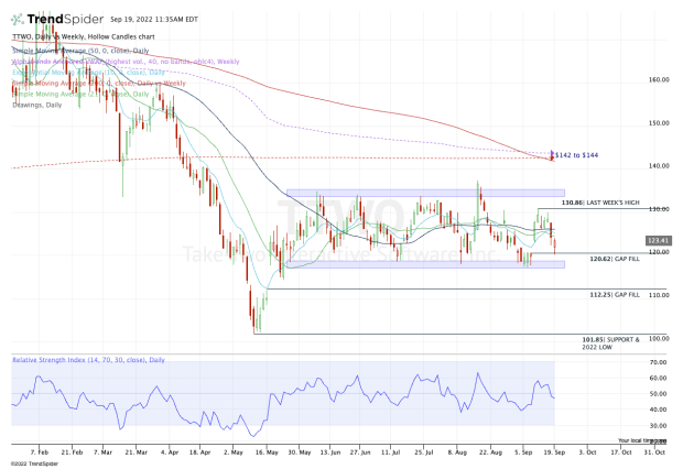 The chart for Take-Two stock is pretty cut and dried: The shares are range-bound between support at $118 to $120 and resistance near $133.