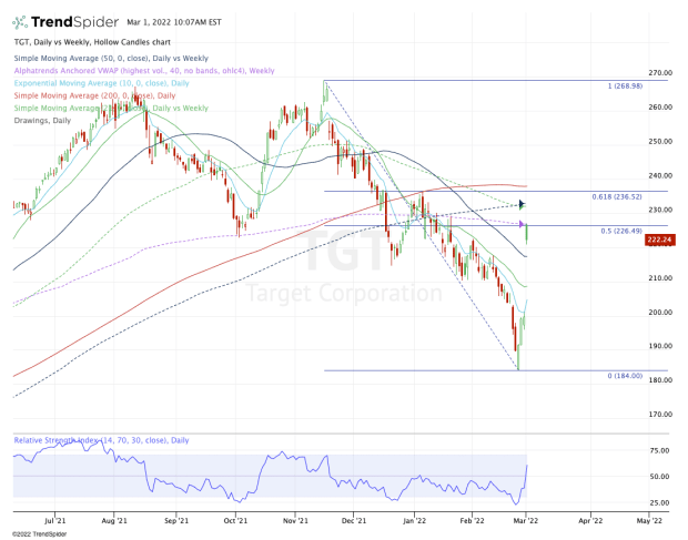 Now riding a four-day winning streak, Target stock is up 21.5% from last week’s low. Before the multi-day rally though, shares were down 31.5% from the high made in mid-November.
