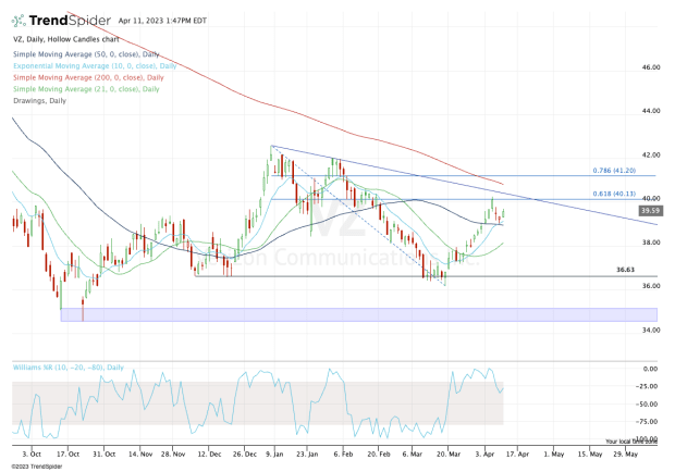 Now it's finding support and the 10-day and 21-day moving averages. Let’s see if Verizon stock can push back up toward $40.