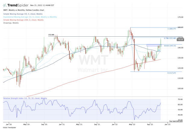 With the rally on Tuesday, Walmart stock is vaulting over resistance in the $142 to $144 area.