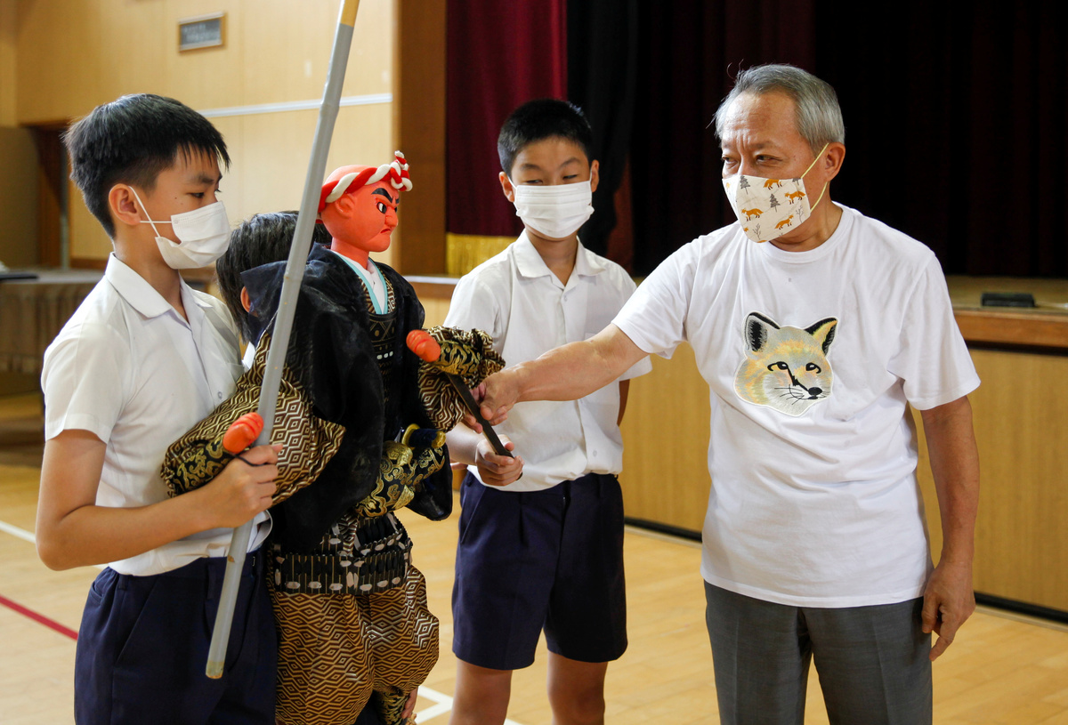 Nearly 30 sixth graders took part in recent classes, with children practicing their puppetry in a gymnasium amid scorching heat, as a T-shirt-clad Kanjuro instructed them.