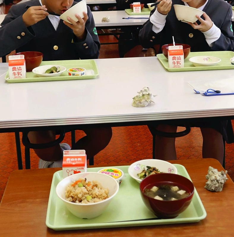 Students at Wajima municipal Oya Elementary School ate steamed rice mixed with sazae on Oct. 16. "The sazae we ate together were really delicious," said a six-grader boy with a smile.