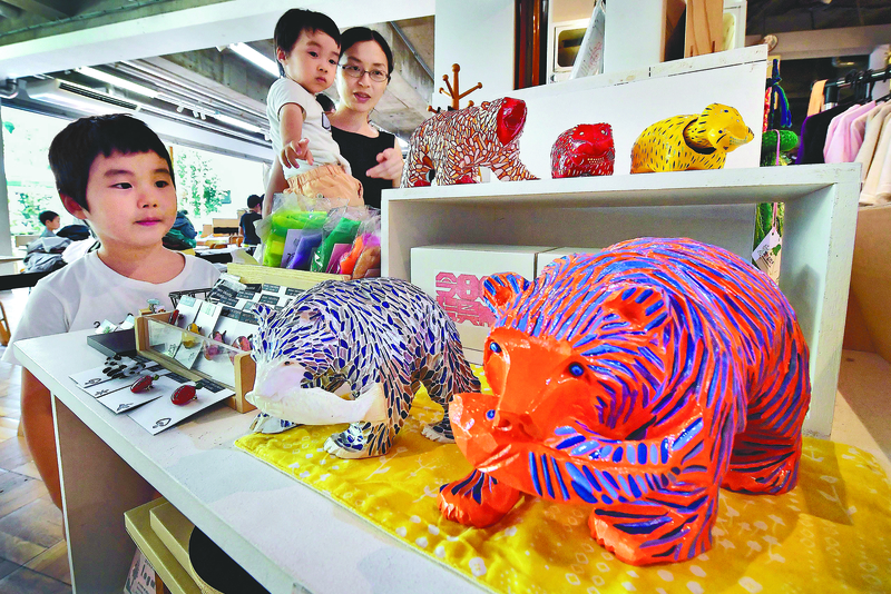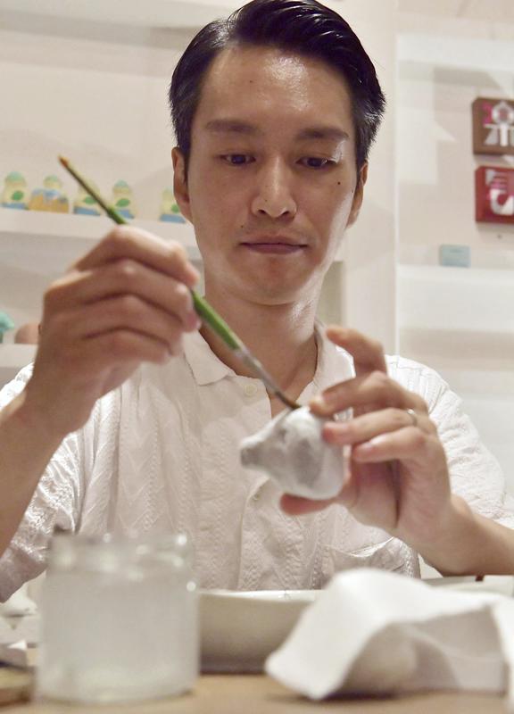 At cultural facility 3331 Arts Chiyoda in Chiyoda Ward, Tokyo, colorful carved wooden bears are on display. Craftsman Go Watabe, 40, buys carved bears secondhand or through online auctions and paints them.
