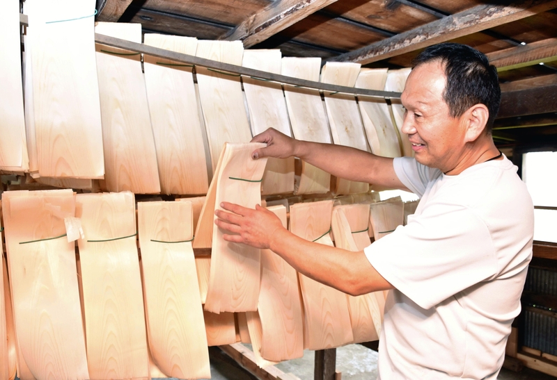 Distribution of food containers made of kyogi has sharply declined since the rise of plastic. Only two kyogi manufacturers currently operate in Tochigi Prefecture, where production once thrived. Shimakura Sangyo in Nasu-Shiobara city, founded 70 years ago, is one of them.