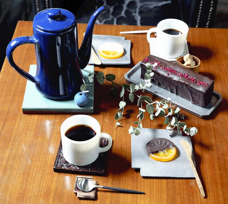 For a cafe-like setting, Ichinose suggested small kawara dishes and coasters featuring family emblems, on which he placed cakes and pottery mugs. The products go well with a wooden table, creating a relaxed atmosphere.