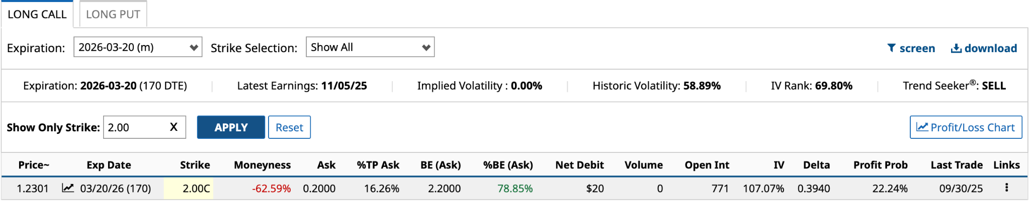 The March 20/2026 expiration date has an expected move of 31.35% in either direction. The $2 call strike has a net debit of $20 or about 16% of its current share price. With a delta of 0.3940, if the share price moves up 51 cents and you close the position before March 20, you could double your money.