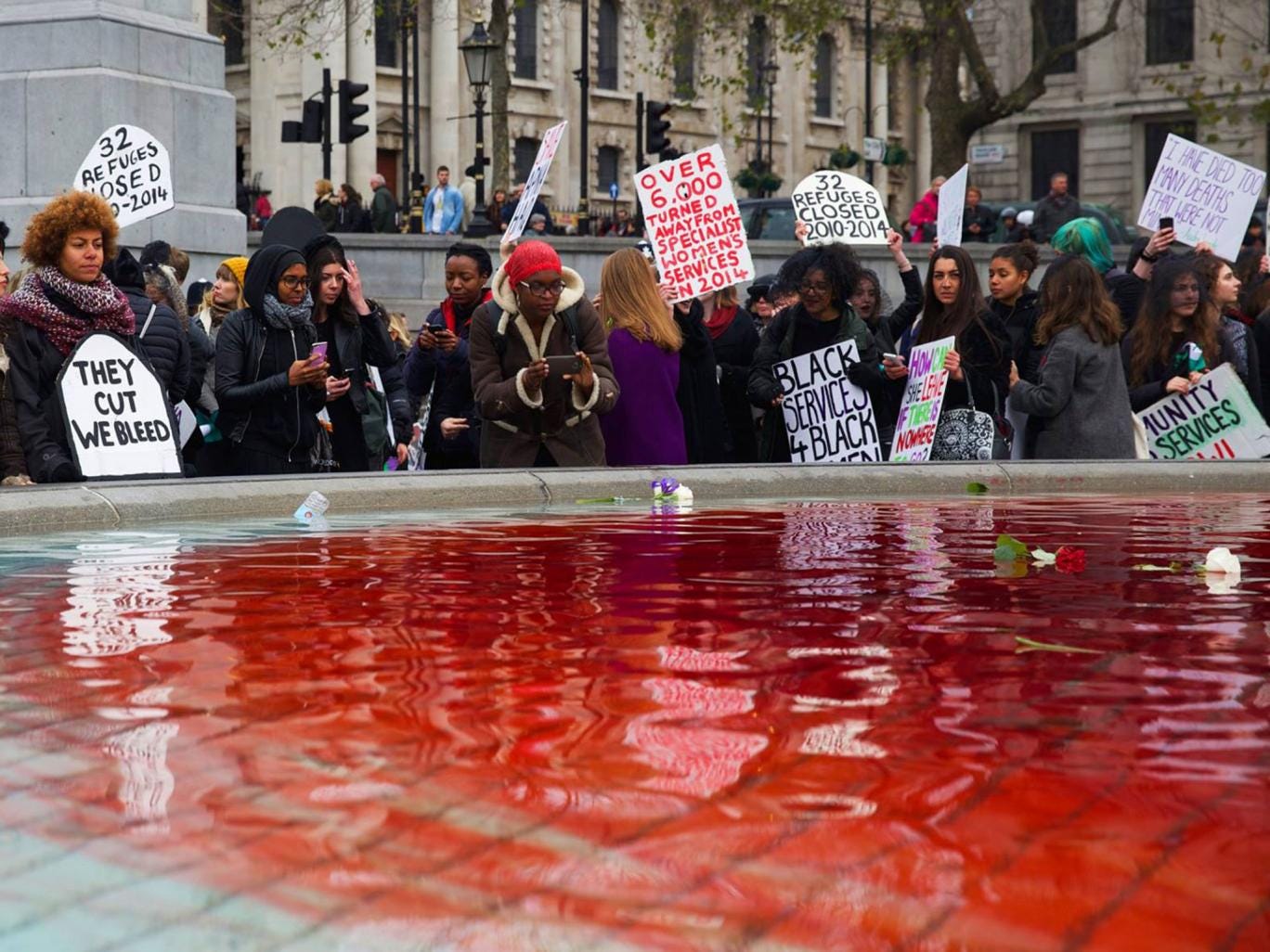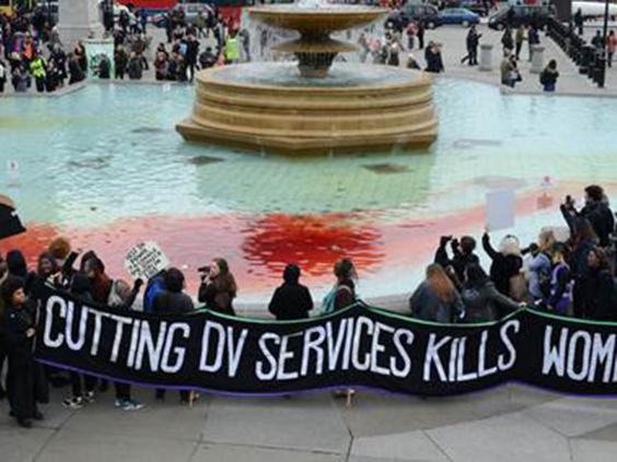 Trafalgar Square’s iconic fountains were dyed red today to resemble the blood of women killed by domestic violence as hundreds protested government cuts.