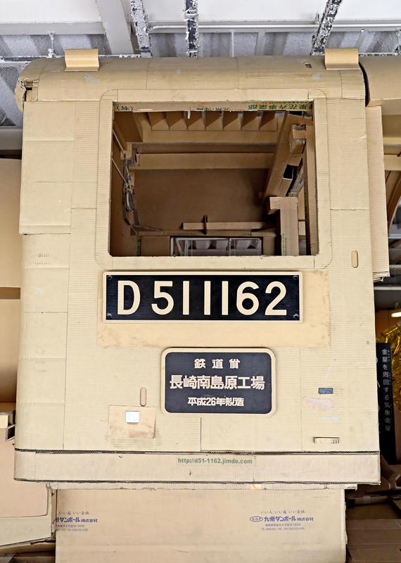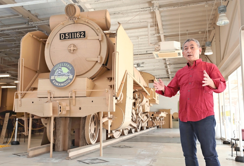 With a driver's compartment that sits high above the rails, a length comparable to two buses, and an appearance as magnificent as a castle wall, a model train on show in Kumamoto Prefecture boasts quite a unique feature: it isn't made of steel, but instead cardboard.