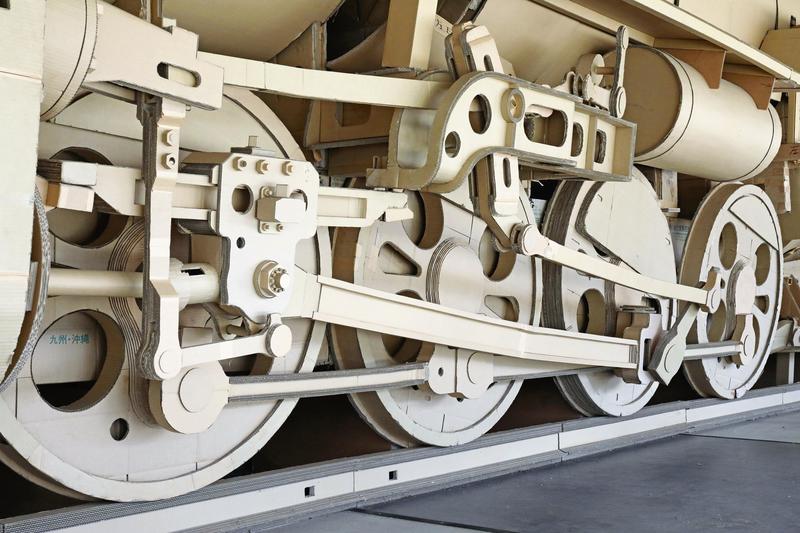 After opening and flattening the cardboard boxes using a box cutter, he cut out the individual pieces. This process was completed in December 2013, 10 months after the project's launch. The parts were then assembled at a warehouse near his workshop where the 20-meter-long and 4-meter-high model was completed. The cardboard itself was formed in such a way that it was able to depict the smooth curved surface of a boiler and the complicated mechanisms around the locomotive's wheels, which were designed to be able to move in the same way as authentic ones.