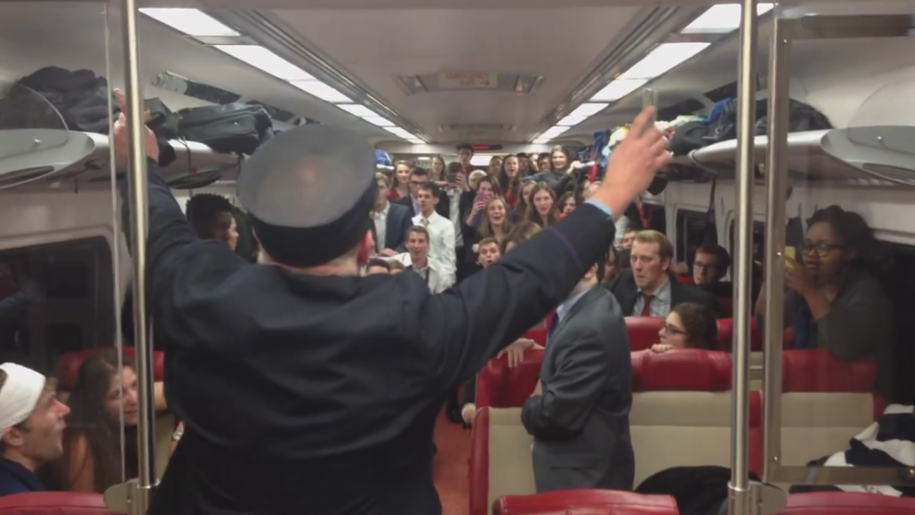 The Internet has fallen head-over heels for a train conductor who broke away from his usual on-board duties to play a different kind of conductor when he realised a well-known Yale University choir was on his train.