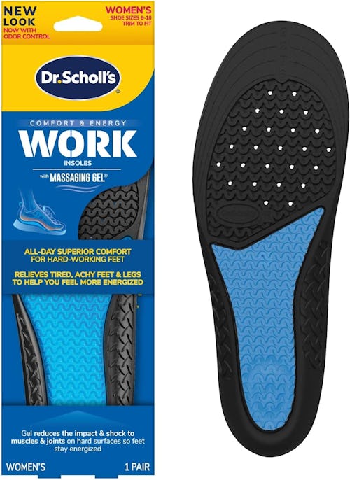 "Monitor the footwear you are using to ensure you have good arch and medial/lateral support,” says Baez. “Ensure the toe box height and width are giving you enough space for your feet." While some of this will dictate a designated shoe shopping trip, if your favorite shoes aren’t offering enough support, add these comfort insoles to boost it. They distribute your weight evenly while the gel wave technology massages your feet as you walk or stand. They will help you end the day with energy.