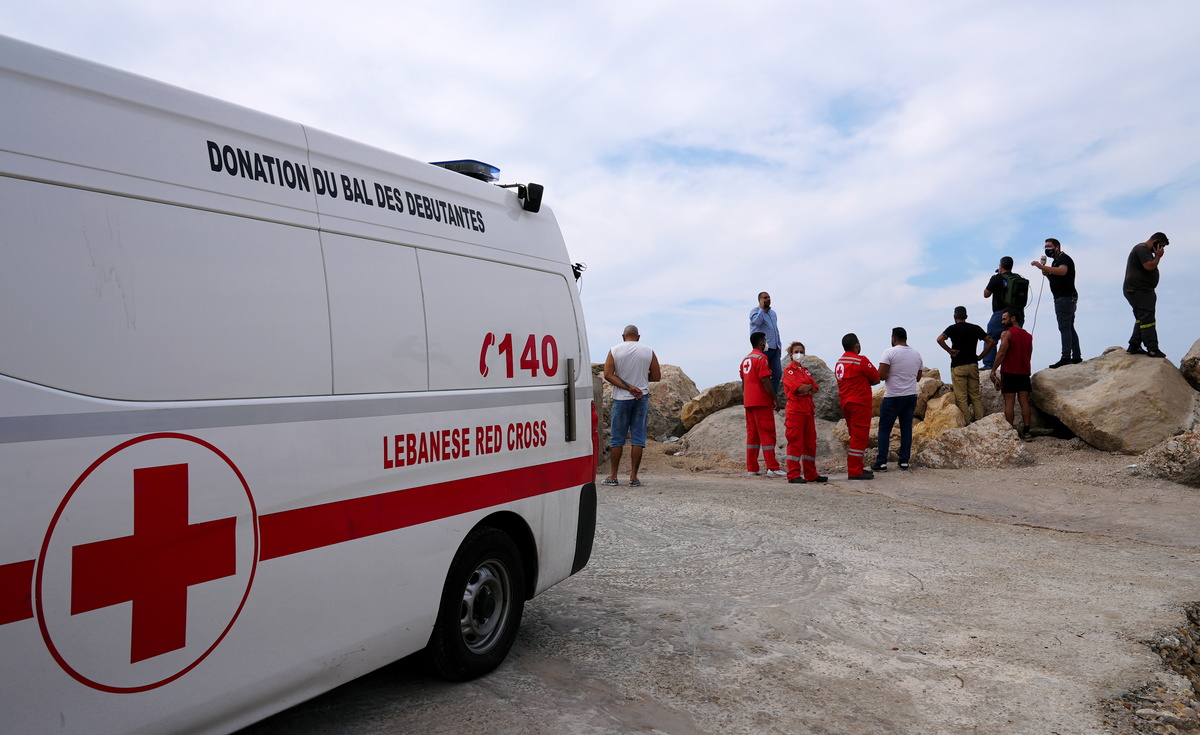 Lebanese Red Cross and Civil Defense members gather during a rescue operation after a small training plane crashed into the Mediterranean Sea off the Lebanese coast, in Halat, north of Beirut, Lebanon October 13, 2021. REUTERS/Issam Abdallah