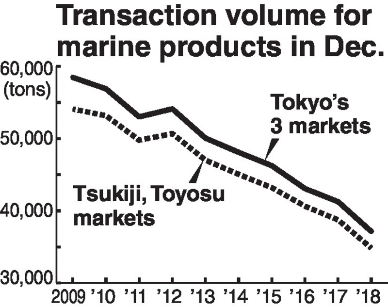 In fact, the transaction volume for marine product markets is showing a declining trend in Tokyo, with the combined transaction volumes at the Toyosu, Adachi and Ota markets dropping 10 percent in December from the previous year.