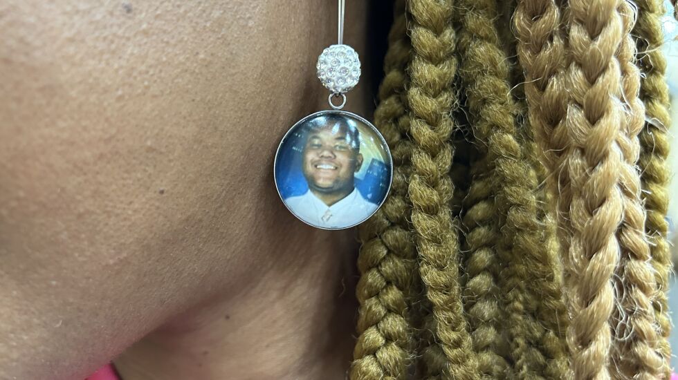 His murder hasn’t been solved, she said. She wore earrings bearing an image of her son to the training session to honor his memory.