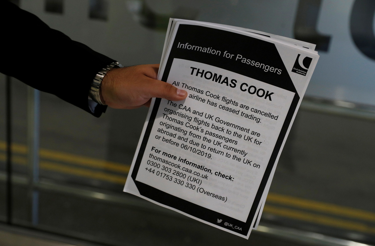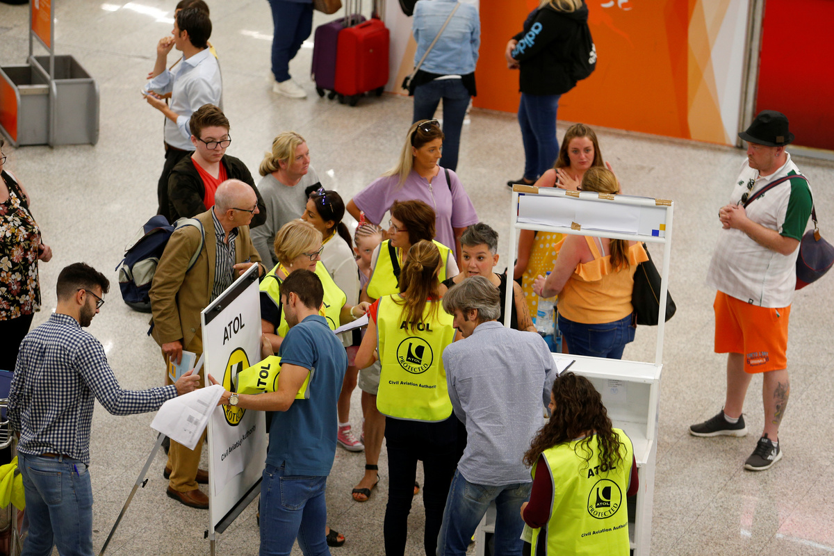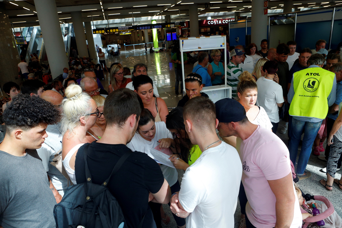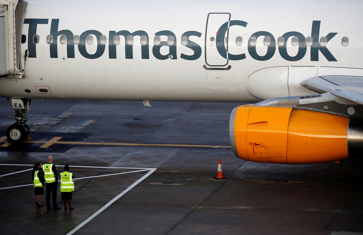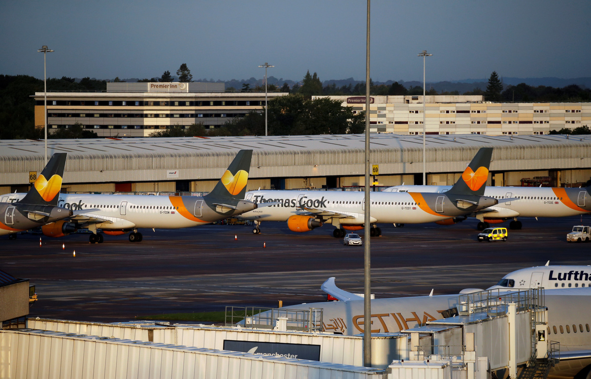 Cancelled flights are seen on screen at Manchester Airport, Manchester, Britain September 23, 2019. REUTERS/Phil NobleA man holds information on Thomas Cook flights at Manchester Airport, Manchester, Britain September 23, 2019. REUTERS/Phil NobleThe last Thomas Cook flight, coming from Orland, U.S., arrives in Manchester, Britain, September 23, 2019, in this still image from social media. Gareth J Bond via REUTERS Passengers are seen at Mallorca Airport after Thomas Cook, the world's oldest travel firm collapsed stranding hundreds of thousands of holidaymakers around the globe and sparking the largest peacetime repatriation effort in British history, in Palma de Mallorca, Spain, September 23, 2019. REUTERS/Enrique CalvoA closed Thomas Cook check-in service is pictured at the Frankfurt Airport, Germany September 23, 2019. REUTERS/Kai PfaffenbachA British Government official assists passengers at Manchester Airport, Manchester, Britain September 23, 2019. REUTERS/Phil NobleAn ATOL official assists passengers at Manchester Airport, Manchester, Britain September 23, 2019. REUTERS/Phil NoblePassengers are seen at Thomas Cook check-in points at Mallorca Airport after the world's oldest travel firm collapsed stranding hundreds of thousands of holidaymakers around the globe and sparking the largest peacetime repatriation effort in British history, in Palma de Mallorca, Spain, September 23, 2019. REUTERS/Enrique CalvoPassengers are seen at Thomas Cook check-in points at Mallorca Airport after the world's oldest travel firm collapsed stranding hundreds of thousands of holidaymakers around the globe and sparking the largest peacetime repatriation effort in British history, in Palma de Mallorca, Spain, September 23, 2019. REUTERS/Enrique CalvoPassengers are seen at Thomas Cook check-in points at Mallorca Airport after the world's oldest travel firm collapsed stranding hundreds of thousands of holidaymakers around the globe and sparking the largest peacetime repatriation effort in British history, in Palma de Mallorca, Spain, September 23, 2019. REUTERS/Enrique CalvoPassengers talk to British government officials at Thomas Cook check-in points at Mallorca Airport after the world's oldest travel firm collapsed stranding hundreds of thousands of holidaymakers around the globe and sparking the largest peacetime repatriation effort in British history, in Palma de Mallorca, Spain, September 23, 2019. REUTERS/Enrique CalvoBritish government officials are seen at Thomas Cook check-in points at Mallorca Airport after the world's oldest travel firm collapsed stranding hundreds of thousands of holidaymakers around the globe and sparking the largest peacetime repatriation effort in British history, in Palma de Mallorca, Spain, September 23, 2019. REUTERS/Enrique CalvoPassengers talk to British government officials at Thomas Cook check-in points at Mallorca Airport after the world's oldest travel firm collapsed stranding hundreds of thousands of holidaymakers around the globe and sparking the largest peacetime repatriation effort in British history, in Palma de Mallorca, Spain, September 23, 2019. REUTERS/Enrique CalvoThomas Cook banner is seen at Mallorca Airport after the world's oldest travel firm collapsed stranding hundreds of thousands of holidaymakers around the globe and sparking the largest peacetime repatriation effort in British history, in Palma de Mallorca, Spain, September 23, 2019. REUTERS/Enrique CalvoPassengers talk to Civil Aviation Authority employees at Mallorca Airport as an announcement is expected on the Thomas Cook's attempts to secure 200 million pounds in extra funding to reach agreement over its recapitalisation and secure its future, in Palma de Mallorca, Spain, September 23, 2019. REUTERS/Enrique CalvoA grounded airplane with the Thomas Cook livery is seen at Manchester Airport, Manchester, Britain September 23, 2019. REUTERS/Phil NoblePassengers are seen at Thomas Cook check-in points at Mallorca Airport as an announcement is expected on the tour operator's attempts to secure 200 million pounds in extra funding to reach agreement over its recapitalisation and secure its future, in Palma de Mallorca, Spain, September 23, 2019. REUTERS/Enrique CalvoPassengers are seen at Thomas Cook check-in points at Mallorca Airport as an announcement is expected on the tour operator's attempts to secure 200 million pounds in extra funding to reach agreement over its recapitalisation and secure its future, Palma de Mallorca, Spain, September 23, 2019. REUTERS/Enrique CalvoPassengers are seen at Thomas Cook check in points at Mallorca Airport as an announcement is expected on the tour operator's attempts to secure 200 million pounds in extra funding to reach agreement over its recapitalisation and secure its future, in Palma de Mallorca, Spain, September 23, 2019. REUTERS/Enrique CalvoPassengers talk to Civil Aviation Authority employees at Mallorca Airport as an announcement is expected on the Thomas Cook's attempts to secure 200 million pounds in extra funding to reach agreement over its recapitalisation and secure its future, in Palma de Mallorca, Spain, September 23, 2019. REUTERS/Enrique CalvoPassengers talk to Civil Aviation Authority employees at Mallorca Airport as an announcement is expected on the Thomas Cook's attempts to secure 200 million pounds in extra funding to reach agreement over its recapitalisation and secure its future, in Palma de Mallorca, Spain, September 23, 2019. REUTERS/Enrique CalvoGrounded airplanes with the Thomas Cook livery are seen at Manchester Airport, Manchester, Britain September 23, 2019. REUTERS/Phil NobleFlight information boards are seen at Mallorca Airport as an announcement is expected on the Thomas Cook's attempts to secure 200 million pounds in extra funding to reach agreement over its recapitalisation and secure its future, in Palma de Mallorca, Spain, September 23, 2019. REUTERS/Enrique CalvoFILE PHOTO: The Thomas Cook logo is seen in this illustration 