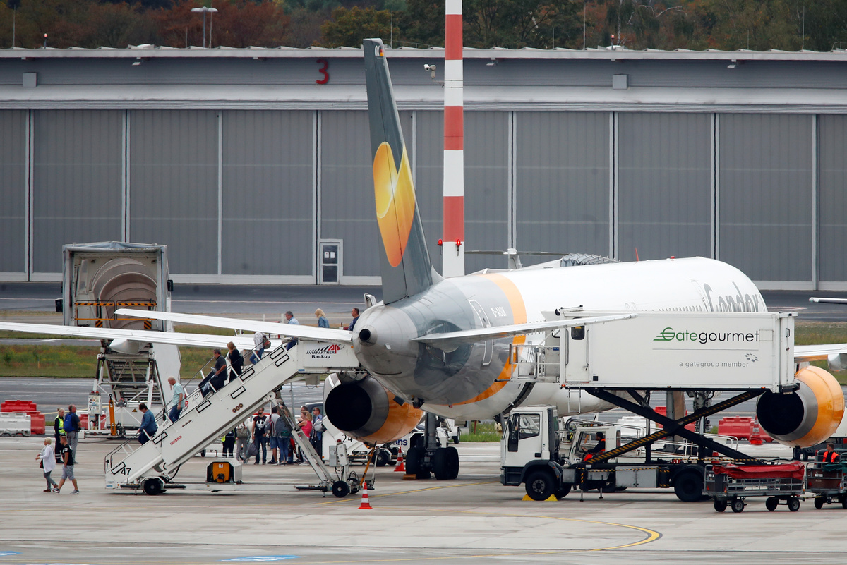 Passengers disembark a Boeing 757-300 of Condor Airlines after landing at Duesseldorf Airport, Germany September 23, 2019. REUTERS/Wolfgang Rattay