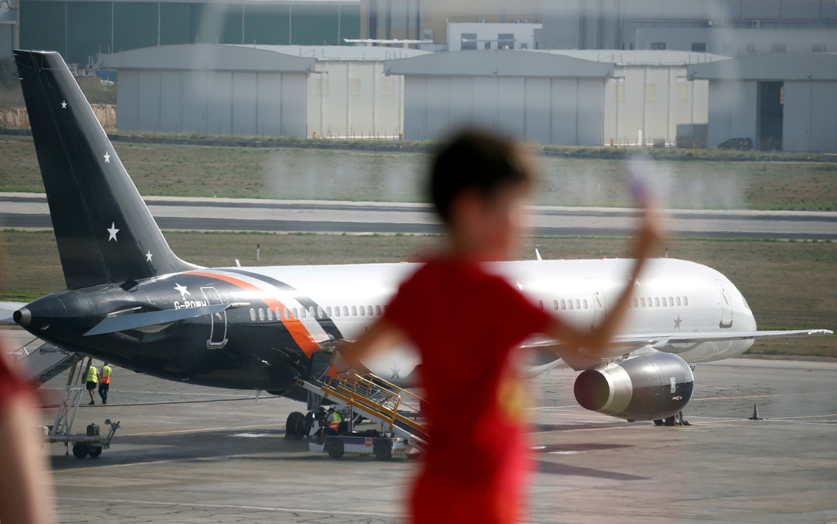 A child plays on the airport terminal observation deck as the aircraft that is being used for tranporting Thomas Cook passengers, a Titan Airways Boeing 757-256 airliner, is seen on the tarmac at Malta International Airport, Malta September 23, 2019. REUTERS/Darrin Zammit Lupi