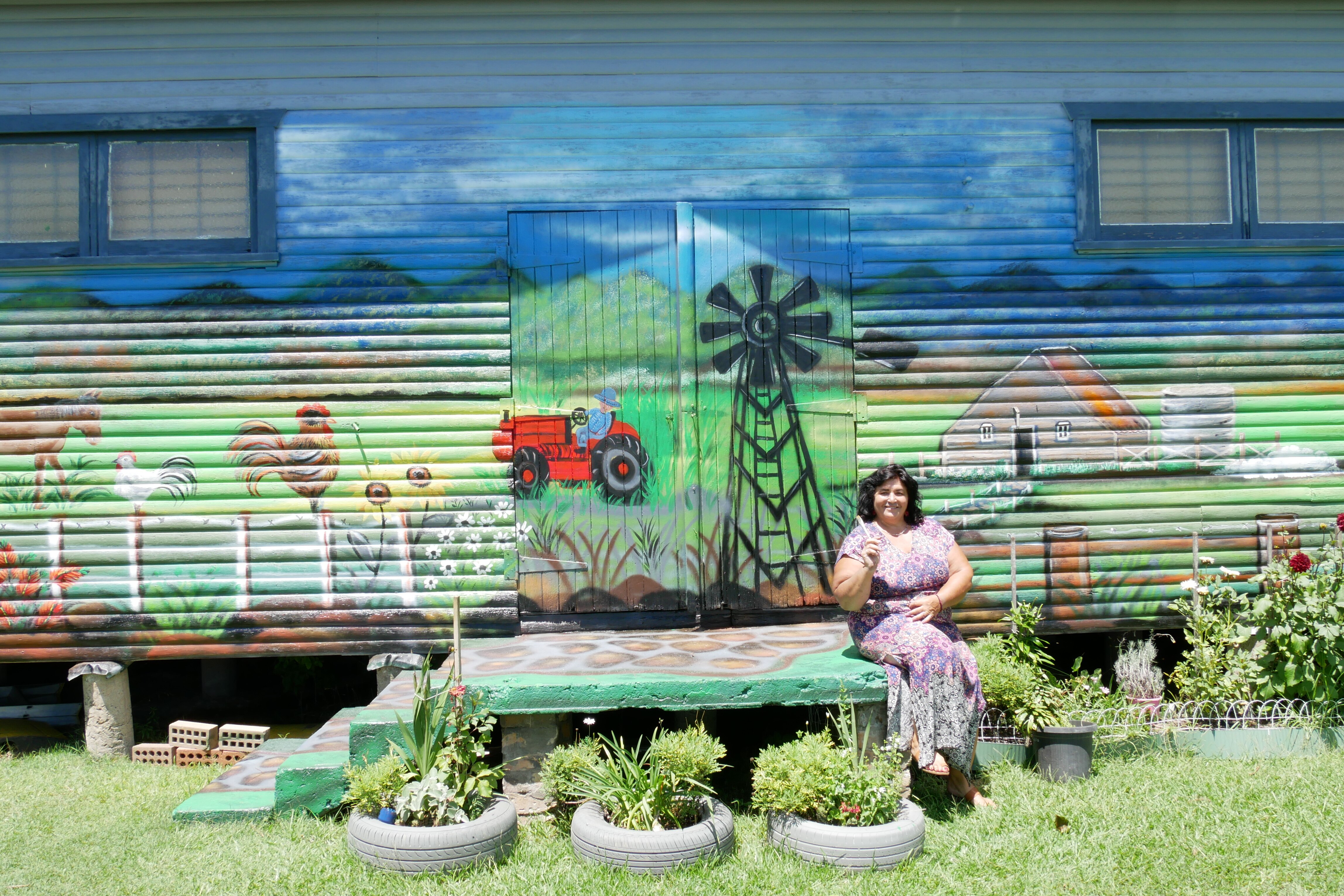 The 59-year-old from Port Stephens has painted three sides of the building with bright rural scenes in a matter of days, despite living with constant nerve pain from an illness in her 20s.