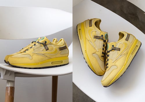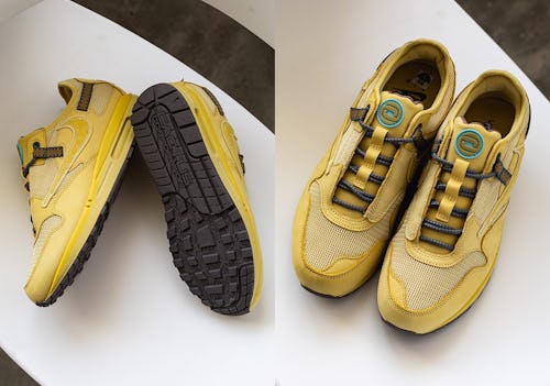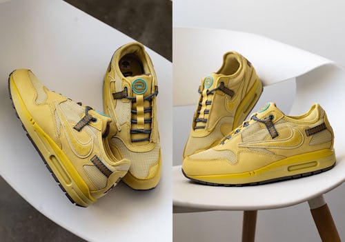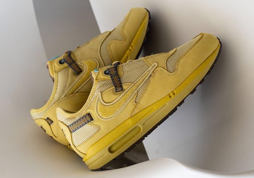 “Wheat” is one of five color schemes coming from the Cactus Jack Air Max, boasting a tonal yellow palette with details in Scott’s signature brown. The Air Max 1’s iconic silhouette is noticeably slimmer with outdoor-inspired elements: a mesh upper, treaded outsoles, and round boot laces. Then, of course, there’s the backwards swoosh. The sunny yellow hue makes a lot more sense with its original spring release date, and is definitely an aesthetic outlier compared to Scott’s usual neutral palette.