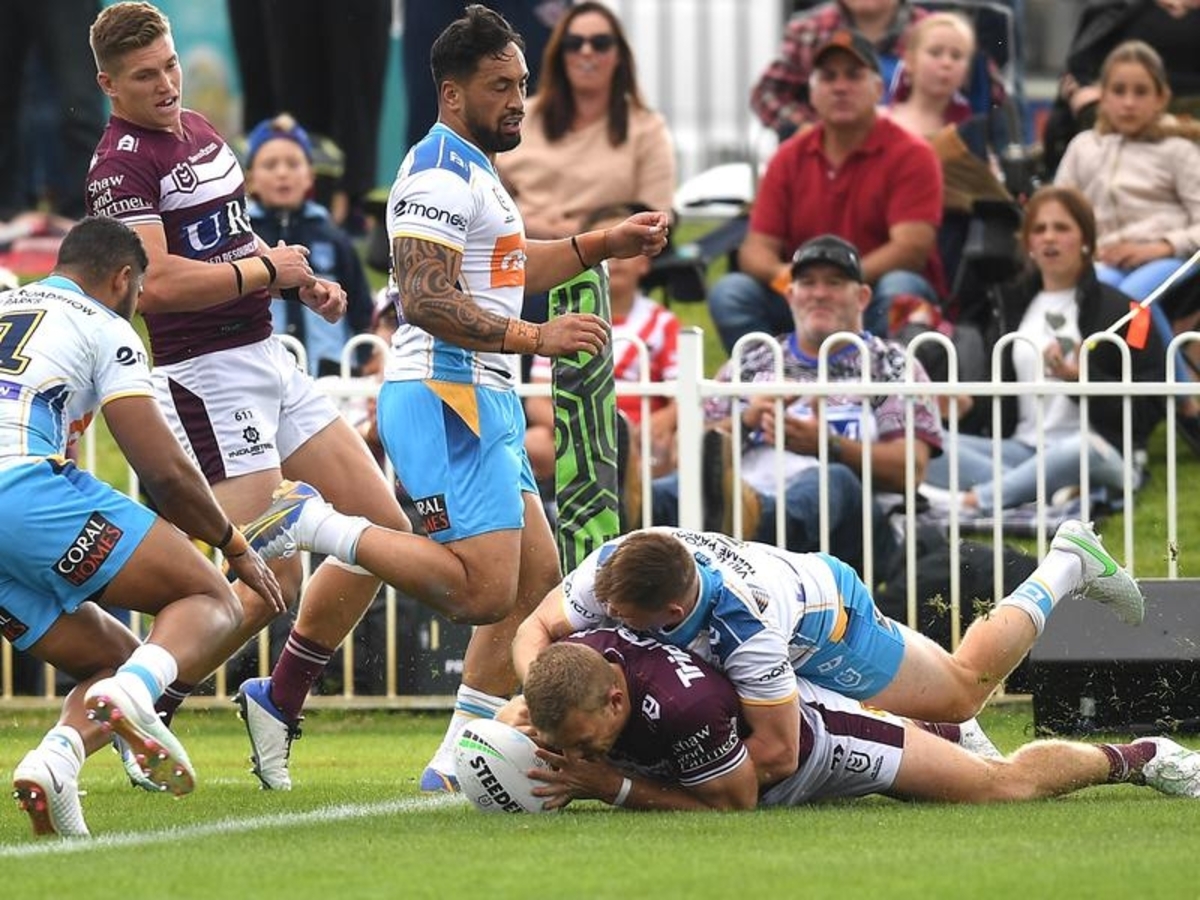 Tom Trbojevic has wasted no time paying Manly back for his bizarre pre-season mishap, starring in a 36-0 shutout of a hapless Gold Coast in Mudgee.