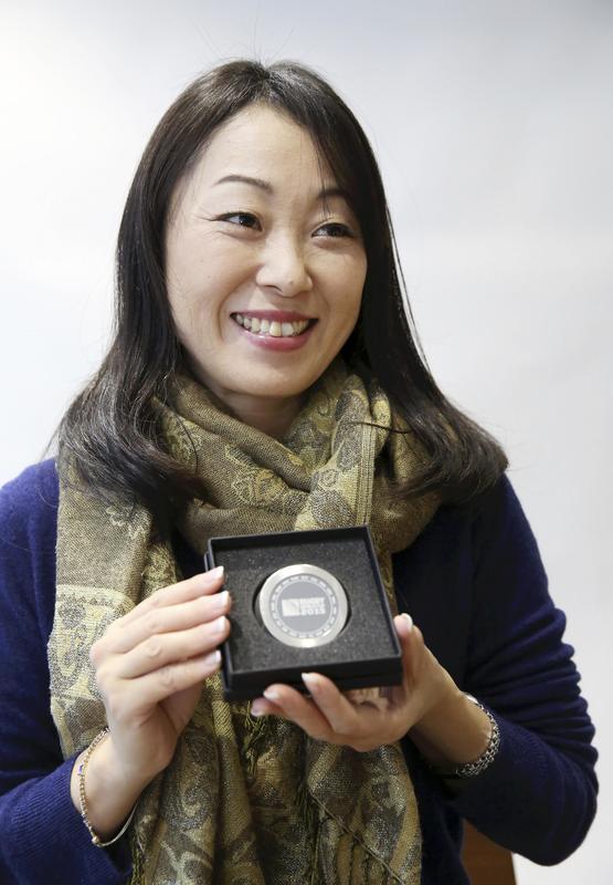 What Kaori Araki holds in her hands is a commemorative medal from the 2015 Rugby World Cup in England. Araki served as a sports psychologist for the Japanese national team from 2012-15 and one of the players, Toshiaki Hirose, presented the medal to her before a match against South Africa.