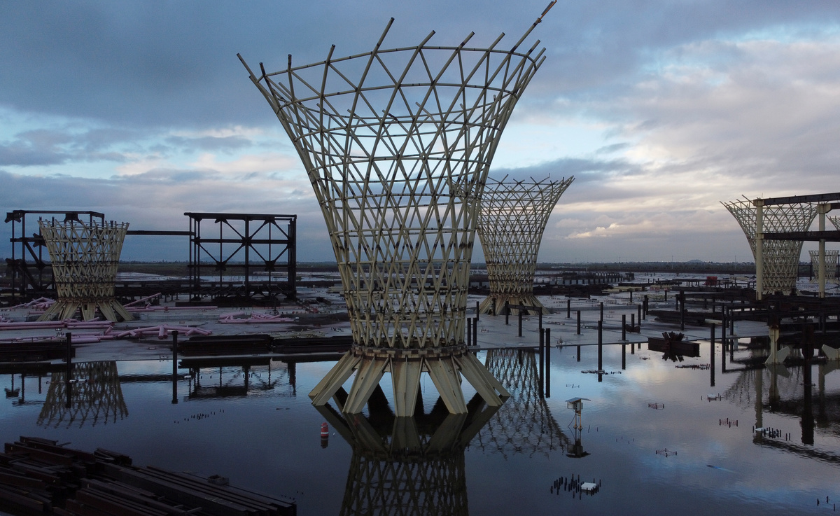 During a visit last week, a moat of green water had risen around a flying-saucer-like building where a control tower juts 20 meters (66 ft) high, less than a third of its intended height.