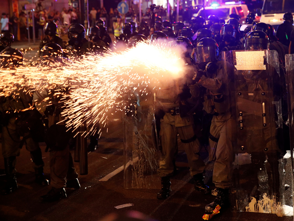 On Sunday police fired rubber bullets and tear gas to disperse activists on the edge of Hong Kong's glittering financial district after they had fled China's Liaison Office.