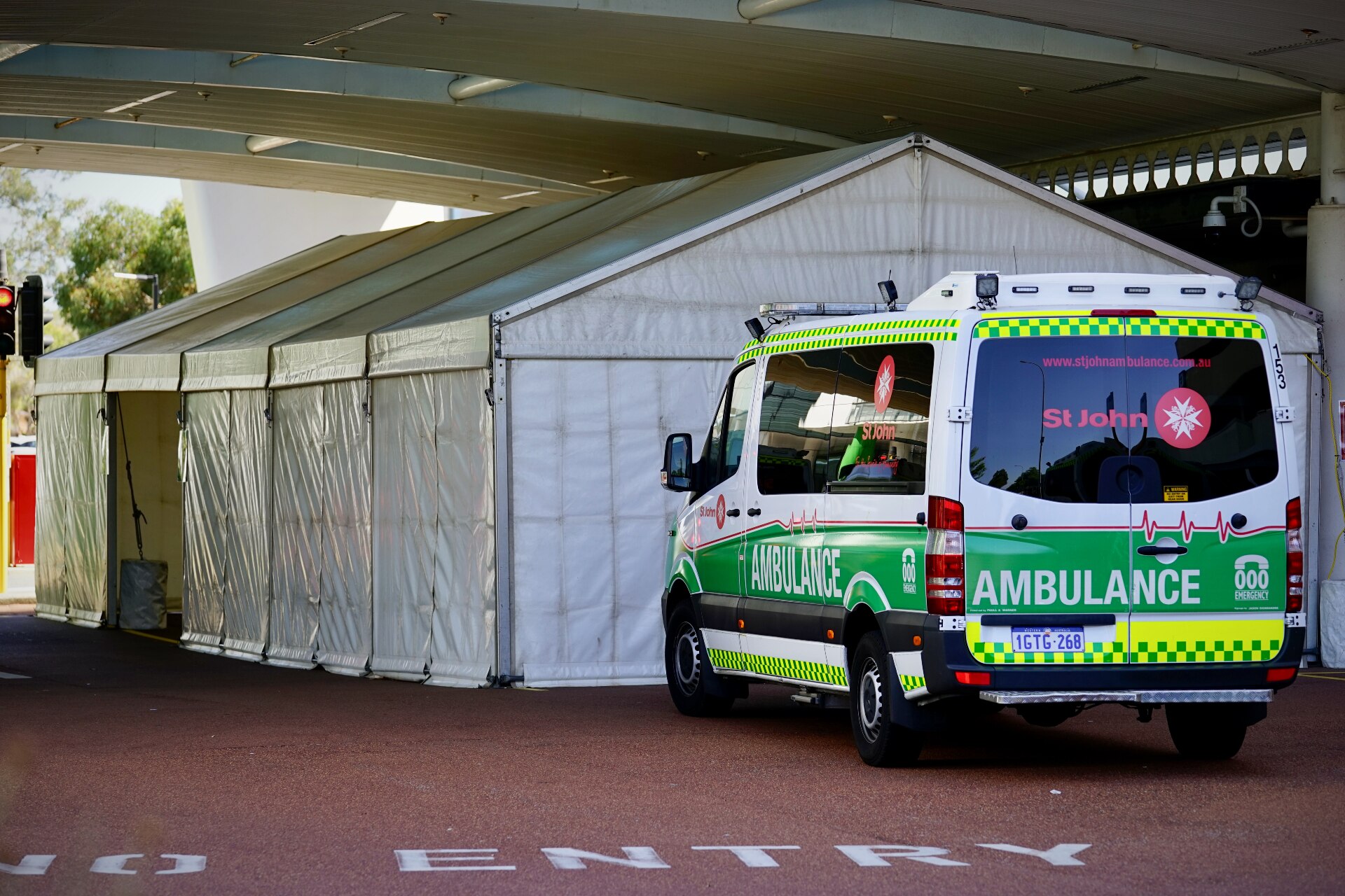A large marquee set up outside the Sir Charles Gairdner emergency department is the first of many that will be erected to help WA hospitals cope with a surge in COVID cases.